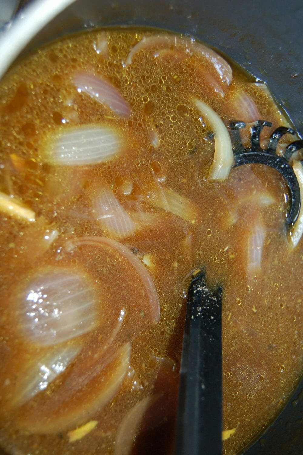 Etter 4 timer heller jeg stekesjyen i en kjele og lar kjeet og løken brune seg på 150 grader i 1 time uten folie.