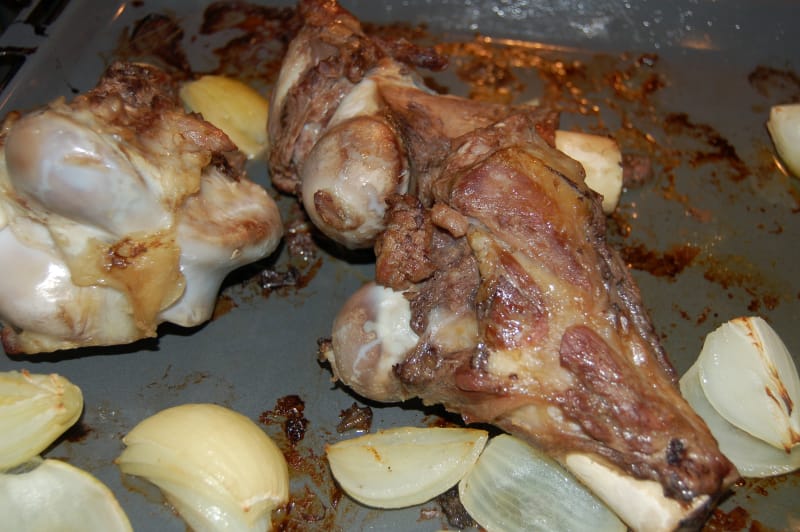 Legg bein og løk i langpanna og stek dem i ovnen på 220 grader, til beina er brune og løken myk (ca. 1 time).