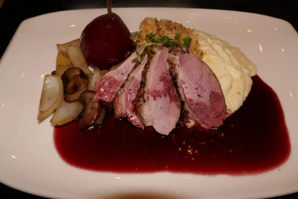 Indrefilet av reinsdyr med soppduchesse, rødvin- og portvinssaus, portvinsmarinerte kirsebær og rosettkål, er er godt alternativ, om du vil servere vilt: