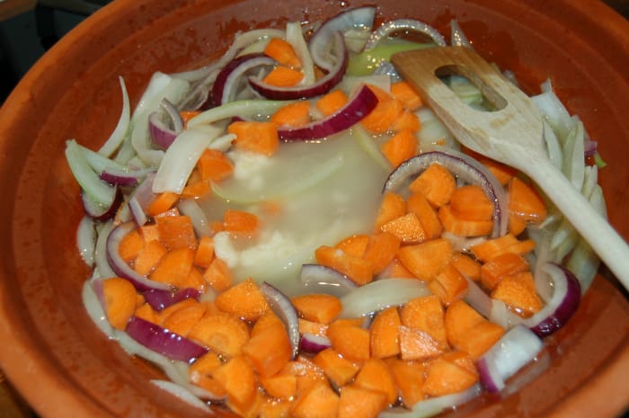 Tagine er en leirgryte med lokk fra Nord-Afrika. Den brukes over åpen varme og kan kjøpes på internett. Siden vi har gassbluss både inne og på utekjøkkenet, bruker vi taginen hele året. Om du ikke har en tagine, kan du bruke en vanlig gryte med lokk. Det fungerer nesten like bra. Vi bruker tabouleh, som er laget av bulgur til, men om du vil, kan du bruke ris. Du får kjøpt raz el hanout i asiatiske butikker, men i det siste har Meny solgt taginekrydder, som du kan bruke i stedet.