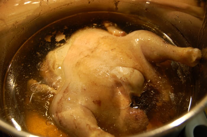 Tips! Resten av kraften koker jeg inn til det halve, sammen med beina fra høna. Jeg siler blandingen, så jeg får en fin kraft, som jeg heller i bokser og legger den i fryseren til senere bruk til f.eks. suppe eller saus.