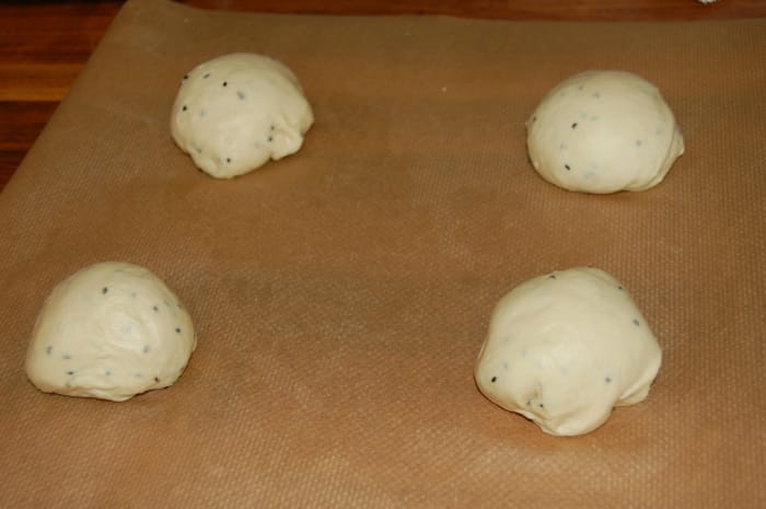 La deigen heve i 1 time, eller mer, før du deler deigen i 8 like deler, form dem til boller og la dem heve i 1 time under et klede.