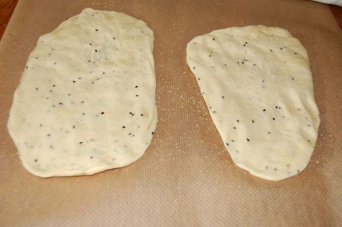 Trykk bollene ut til oval fasong, gjerne ganske tynne. Legg dem på stekebrett med bakepapir og strø på hakket hvitløk. Press hvitløken litt ned i deigen og la dem heve i 30 minutter til.