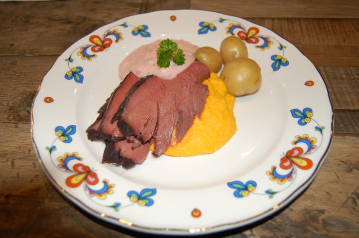Serveres f. eks. med puré av gulrot eller erter, kokte poteter, flatbrød og tyttebærrømme.