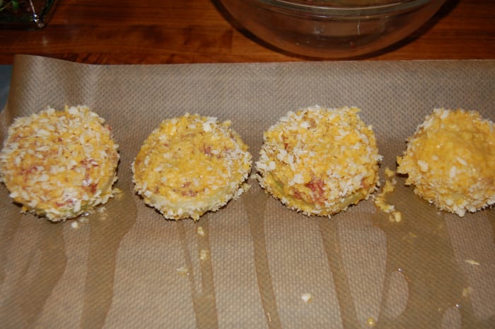 Ha hvetemel, sammenvispede egg og panko i tre separate boller. Dypp en ring i melet, rist av overflødig mel, vend den deretter i eggebollen, så panko, deretter tilbake til eggene, en siste gang i pankoen og legg den på bakeplaten. Gjenta med de resterende ringene.