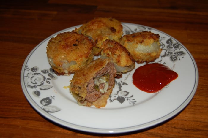 Cheeseburger onion rings er en oppskrift den yngste sønnen min fant på internett for mange år siden. Det er mye av de samme ingrediensene som i en burger, men her er alt i ett og kan brukes som en deilig kveldssnack og det smaker overraskende godt.
