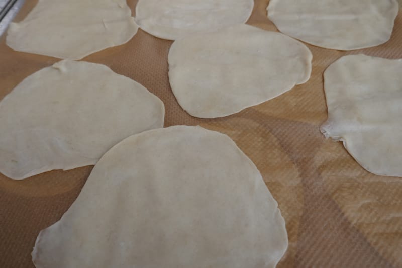Kjevle deigen ut i et rektangel som er ca. 10 x 30 cm. Smør den siste skjeen med olje utover deigen og rull den sammen til en pølse. Del pølsen i biter på størrelse med golfballer. Kjevle hver golfball ut i tynne, flate lefser. De skal være så tynne at du nesten kan se igjennom dem.