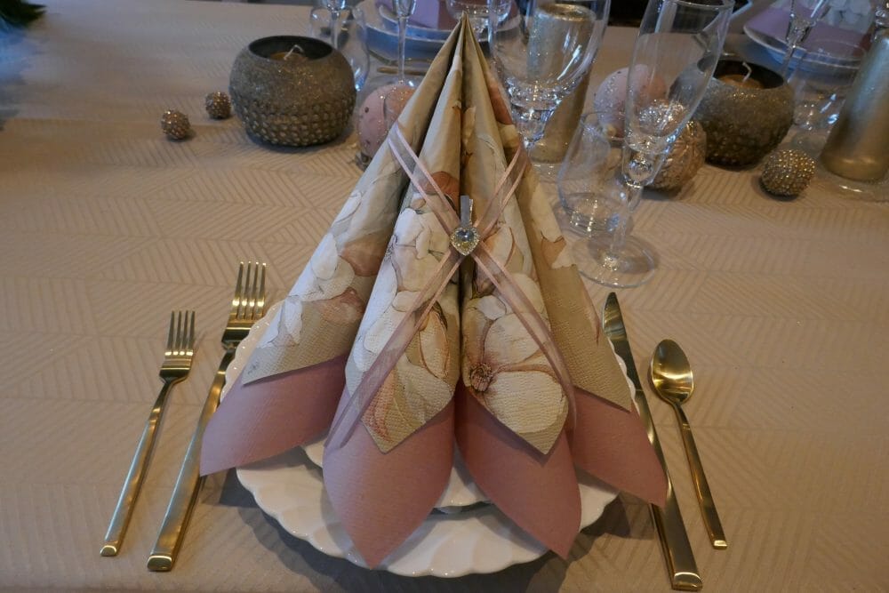 Festbord i sotrosa og gull kan brukes til mange slags anledninger, fleks. jubileer, navnefest, konfirmasjon eller nyttårsfeiring.