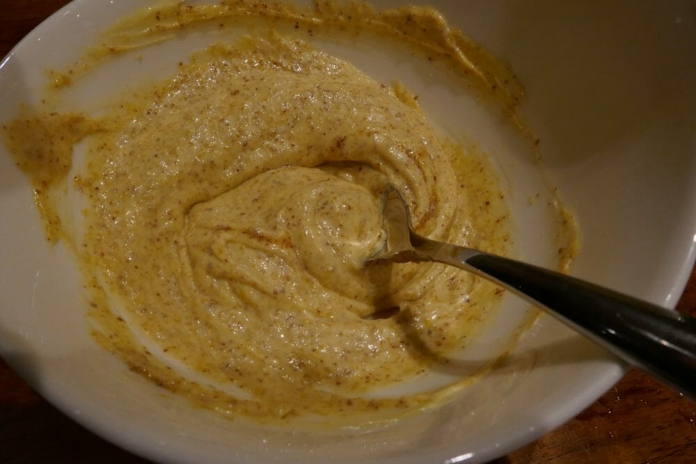 Bland majones og og sennep i en bolle og smør 2/3 av blandingen utover kyllingfiletene.
