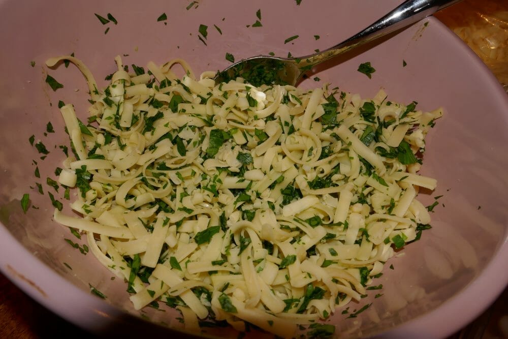 Bland ost og persille i en annen bolle og fordel det over kyllingfiletene, før du ruller dem sammen og legger dem med skjøten ned i en ildfast form, smurt med olivenolje.