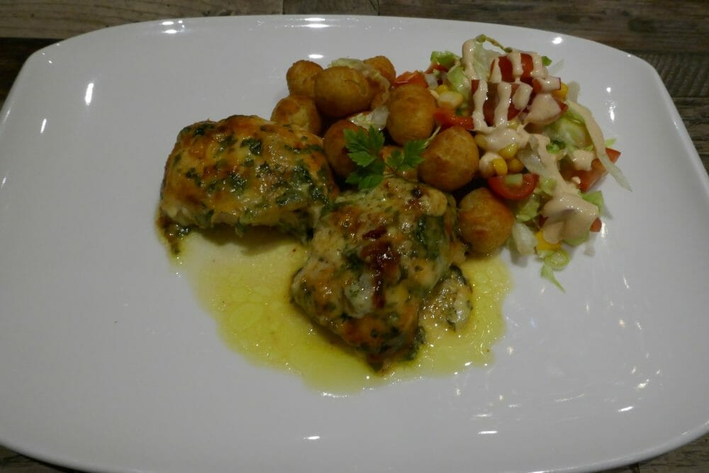 Server kyllingrullene med valgfritt tilbehør. Jeg har brukt pommes noisettes, som du kan finne i frysedisken eller finne oppskrift på her og en salat med isbergsalat, paprika, vårløk, mais og tomat. Dressingen finner du oppskrift på her.