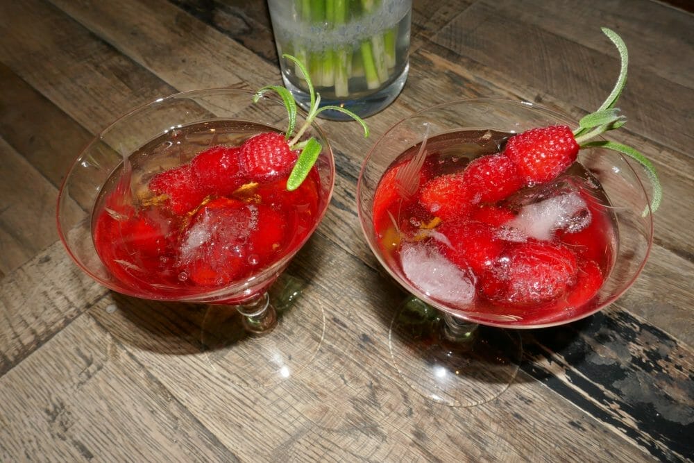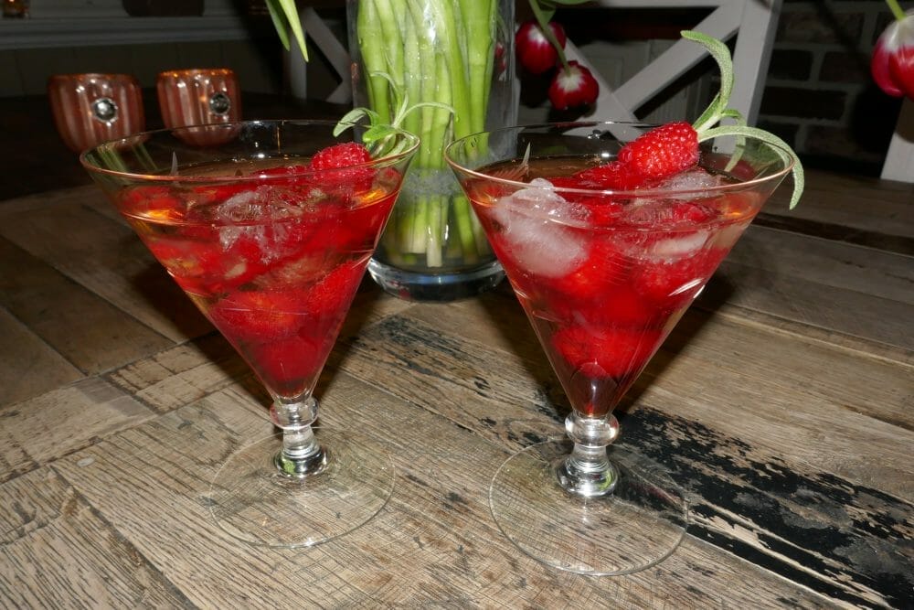 Tilsett bacardi razz, bringebærlikør og lime og rør godt. Tilsett sodavann og pynt med bringebær, tredd på en rosmarinrosmarinkvist.