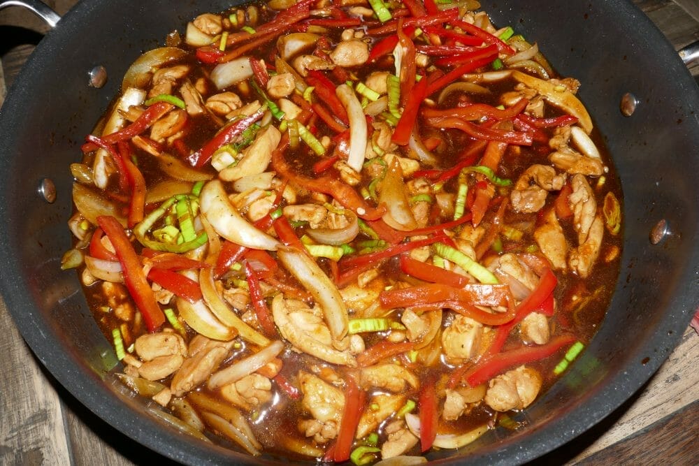Brun kyllingkjøttet i pannen til det er halvstekt. Bland svart peppersaus, østerssaus, soyasaus, sukker, sesamolje og kyllingkraft i en bolle eller litermål og hell det over kyllingen. Tilsett løk og det småkoke til kyllingen er gjennomkokt. Om du synes sausen er for tynn, kan du røre inn litt maisennajevner. Rør inn paprika og purre og la det kose seg ett par minutter, før du serverer med ris, kokt etter anvisning på pakken.