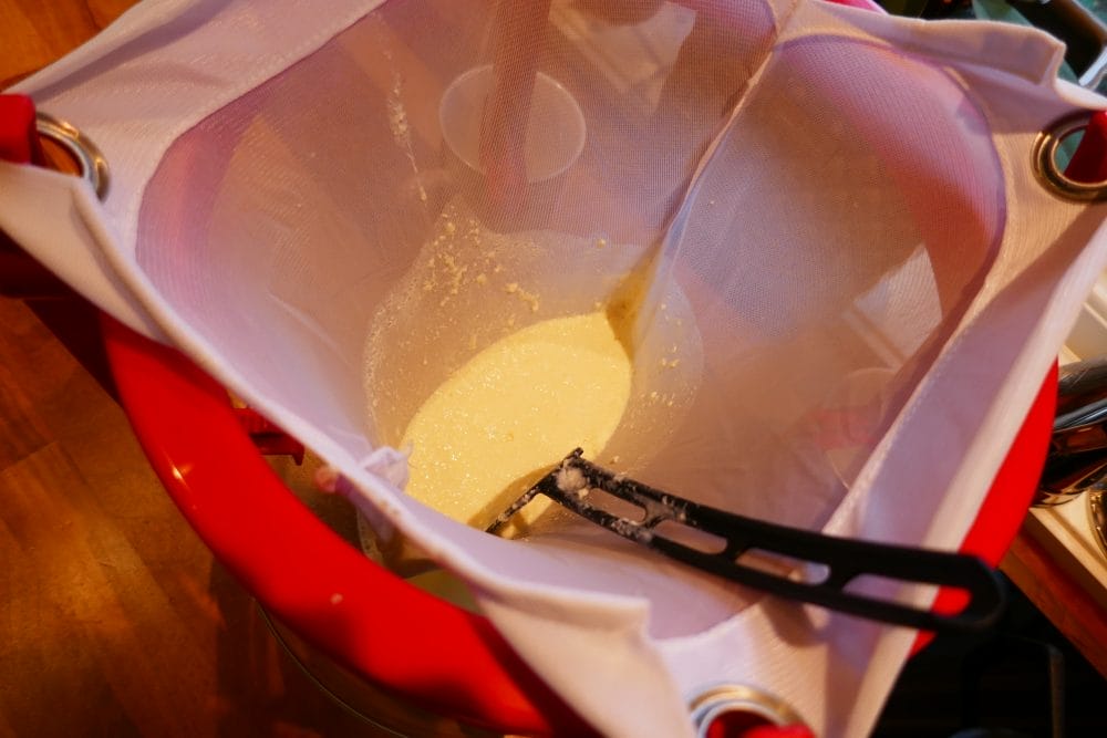 Løft kjelen vekk fra platen og rør inn sjokoladen. Klem vannet ut av gelatinen, og smelt den direkte i den varme blandingen. La blandingen stå til avkjøling i noen minutter.