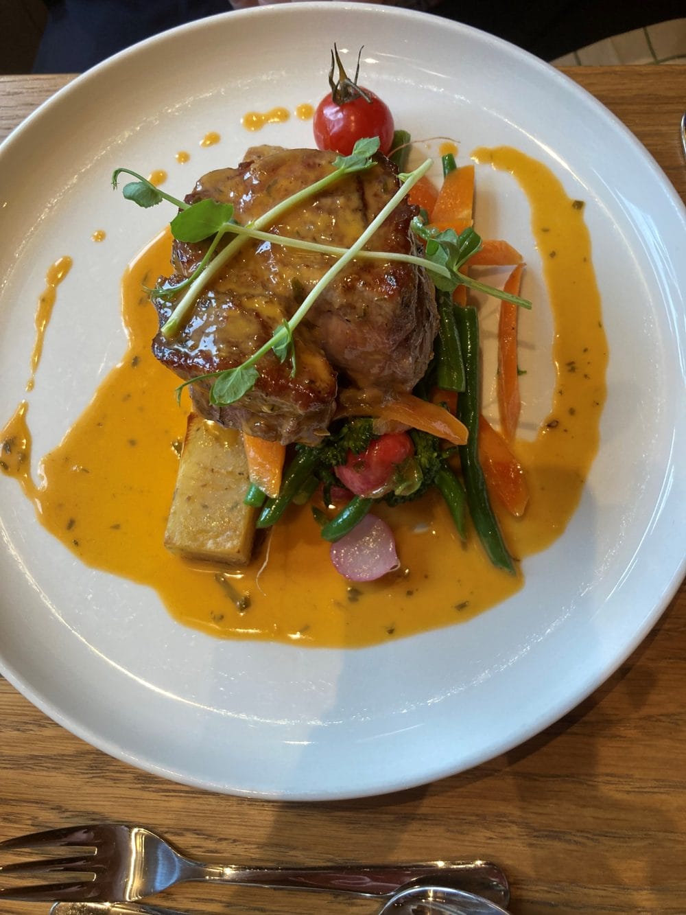 Den ene hovedretten ble marinert entrecôte av kalv, potetterte, sesongens grønnsaker og estragonsmørsaus. Kjøttet var mørt, grønnsakene tilberedt med perfeksjon og sausen var en innertier.
