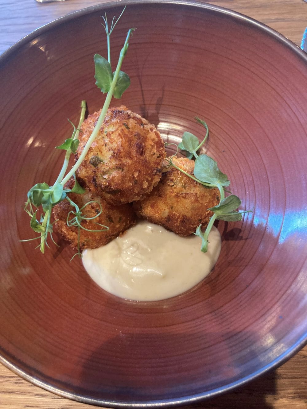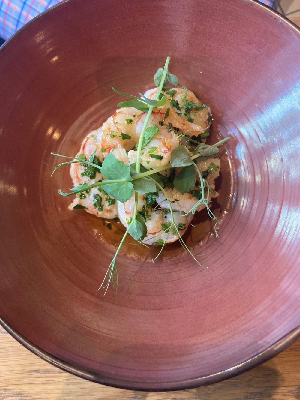 Til forrett valgte vi hvitløksbakte kongereker og klippfiskkroketter med aioli.