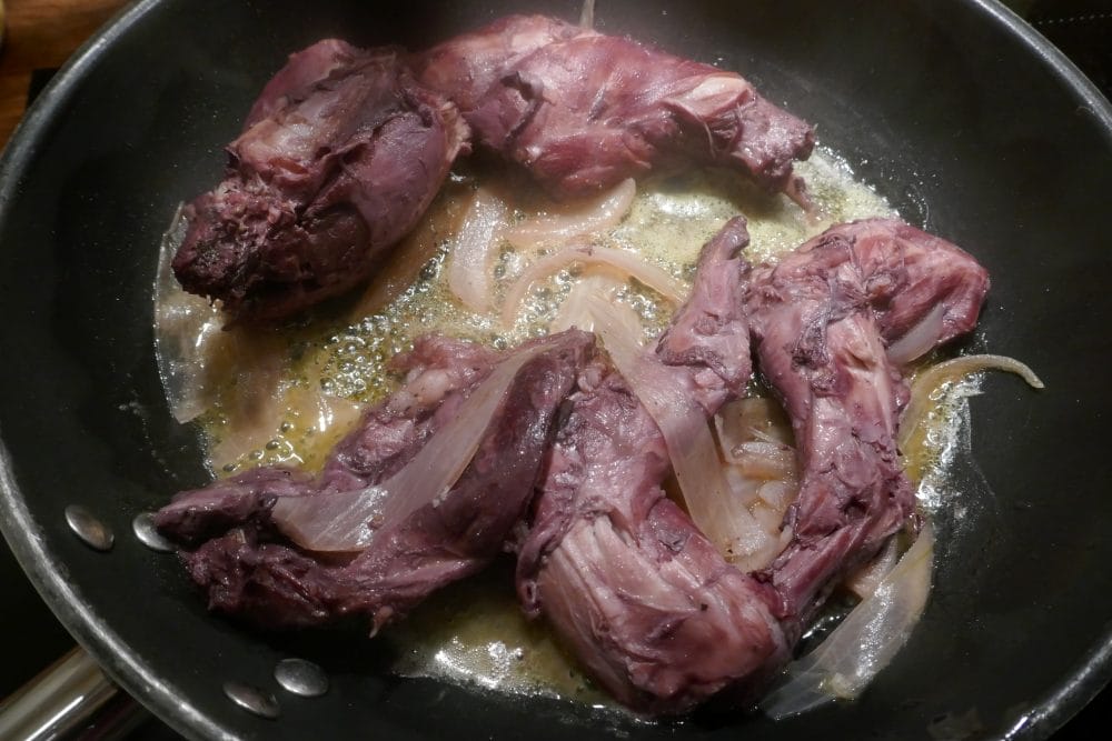 Hell i frosne erter, kok opp og server kanin som på Malta.