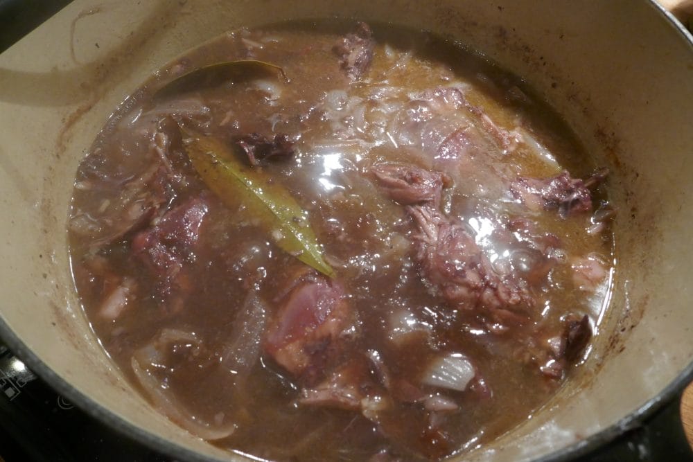 Legg alle delene i en gryte, hell over rødvin så det dekker og tilsett hvitløk, løk og laurbærblader. La kaninen ligge i marinade, helst over natten, men minimum i 6 timer. Ta opp kaninen fra marinaden rett før du skal brune den. Varm opp smør og olje i en stekepanne og brun kaninbitene på alle kanter. Samtidig koker du opp marinaden og legger kaninen tilbake i den, etter hvert som den er ferdig brunet. Kok kaninen i 2 timer, den første timen under lokk og den andre uten, så marinaden tykner til en god saus. Smak til med pepper og kyllingfond, til du synes den er passe salt. Om du vil ha tykkere saus, kan du røre inn litt maisenna mot slutten av koketiden.