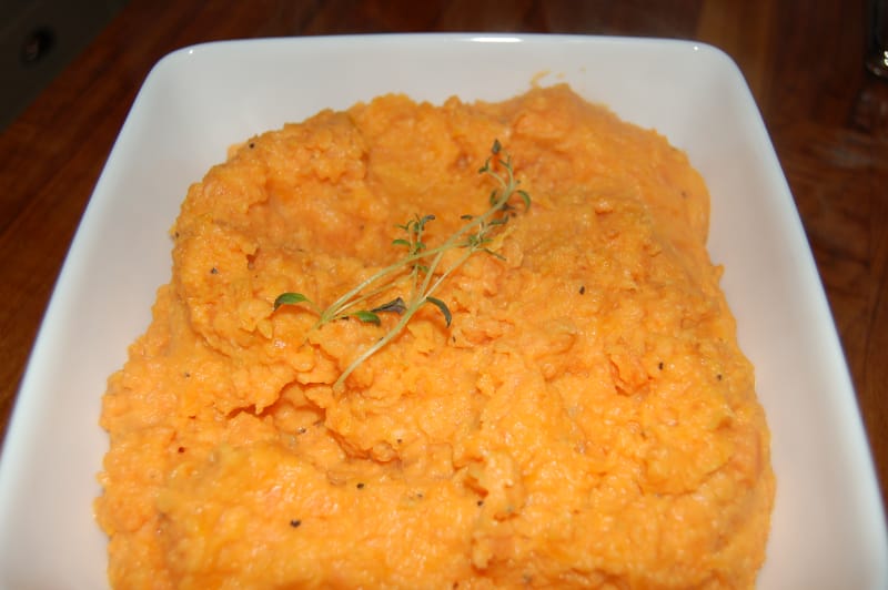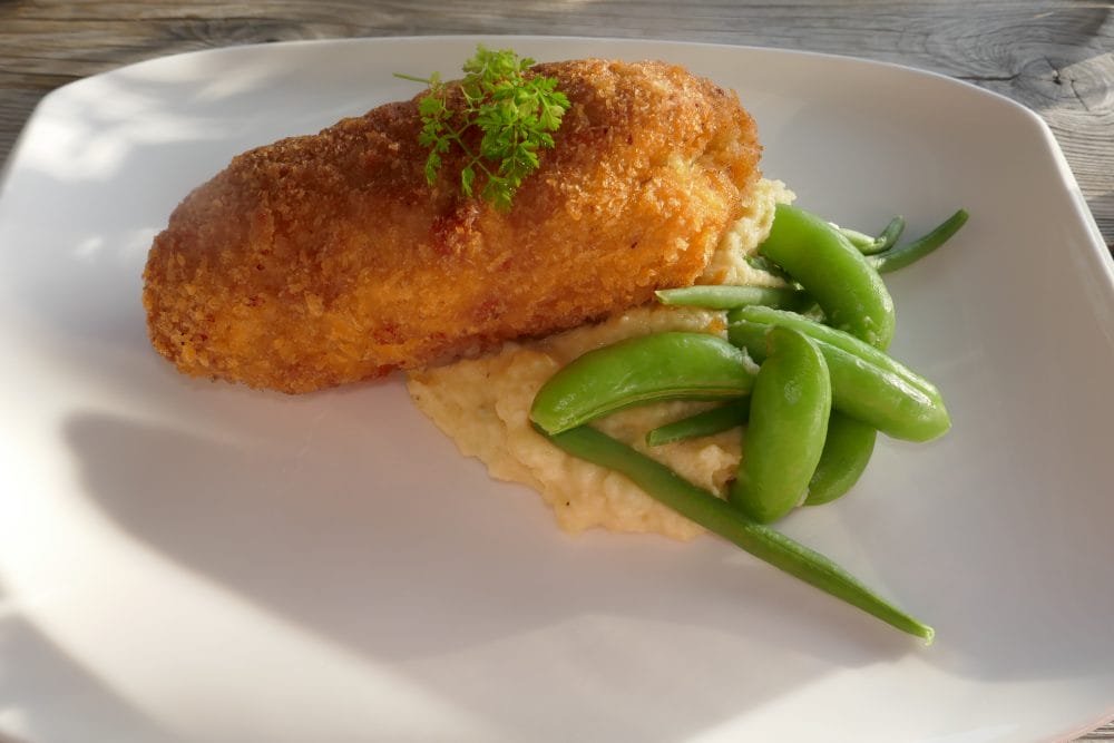Server med ønsket tilbehør, f.eks. erter og potetmos, som du finner oppskrift på HER.