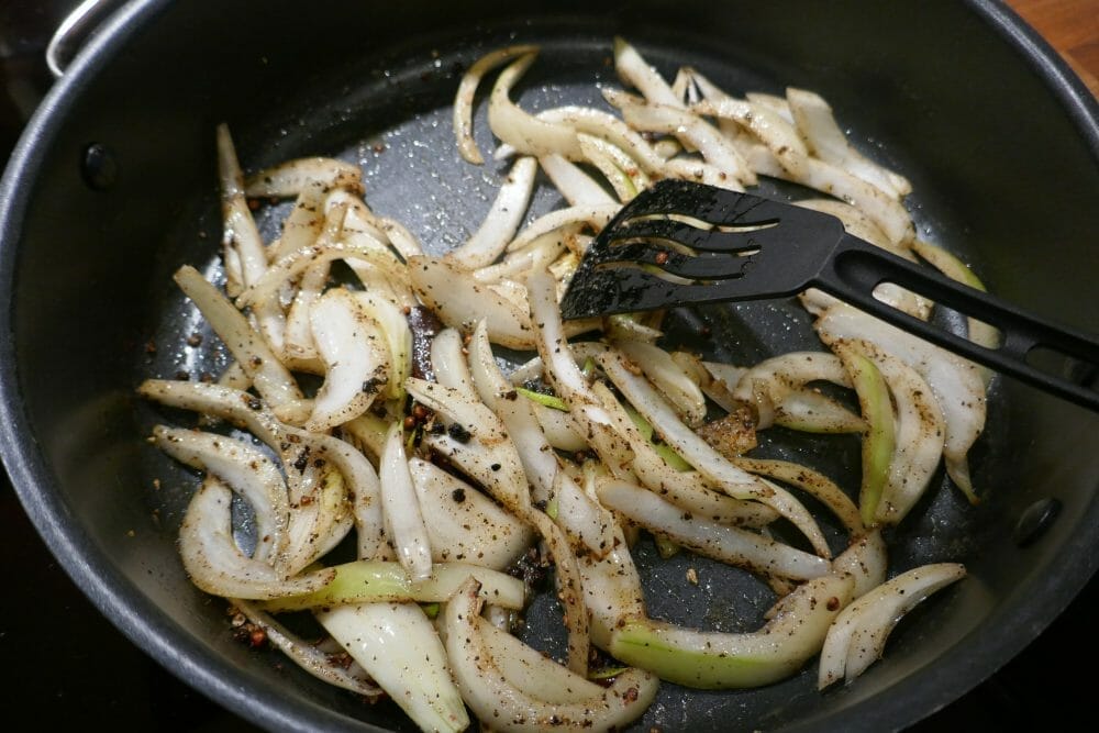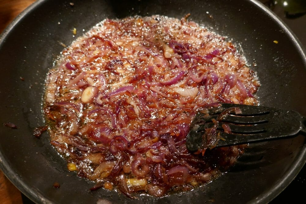 Varm smør og olje i en stekepanne. Legg i løken og la den brunes på middels temperatur, så mye at den blir karamellisert, uten å bli brent. Rør og av og til og sett til side til den skal serveres.