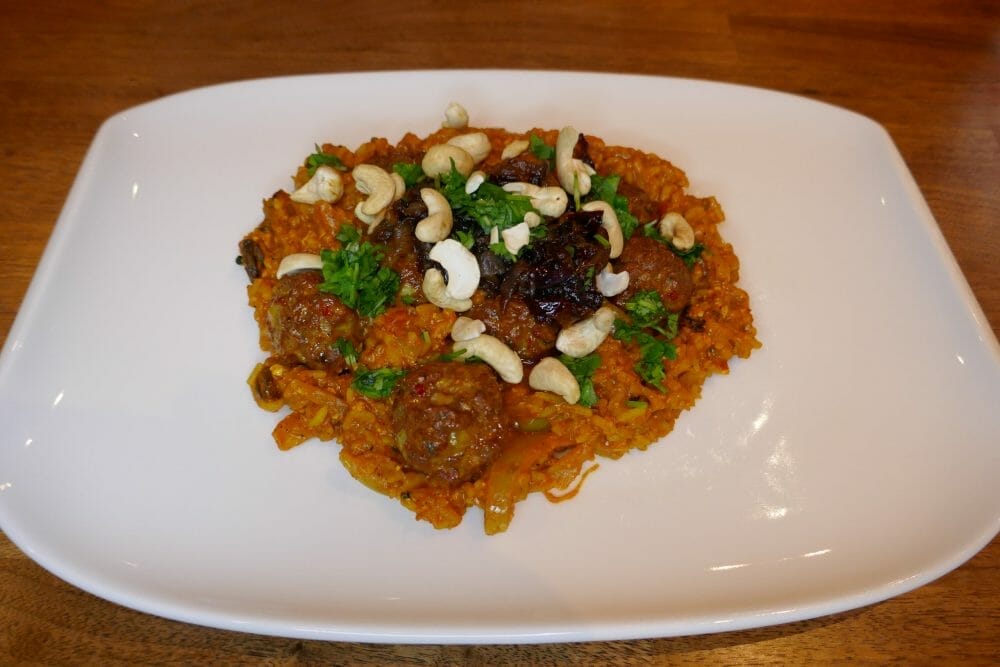 Lammebollebiriyani er kanskje min favorittrett Sør-Asia og kjært barn har mange navn, f.eks. biriani, beriani, briyani, breyani, briani, birani, buriyani, bariania og beriani. Biriyani kommer fra det persiske order berya som betyr stekt eller ristet. Lammebollebiriyani har masse smak og løken på toppen er stekt så lenge at den er naturlig søt.