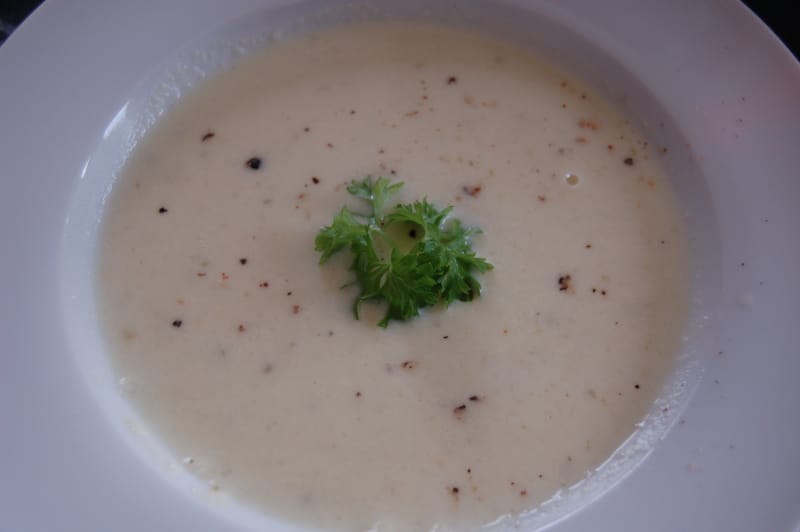 Blank løken mør i smør. Tilsett hvitvin og laurbærblader og la det koke inn til grøtkonsistens. Tilsett fløte, kyllingfond, konjakk, gressløken og osten. Kok i noen minutter, til sausen får fin konsistens.