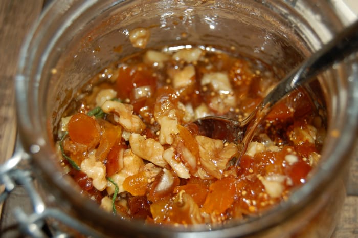 Del aprikos, fiken og dadler i små terninger. Varm honningen i en kjele på lav temperatur sammen med frukten. Trekk kjelen til side og bland inn valnøtter og rosmarinblader. Hell blandingen over på et glass. Det smaker best om du lar det stå til neste dag, men det kan også spises med en gang, om du ikke har tid til å vente.