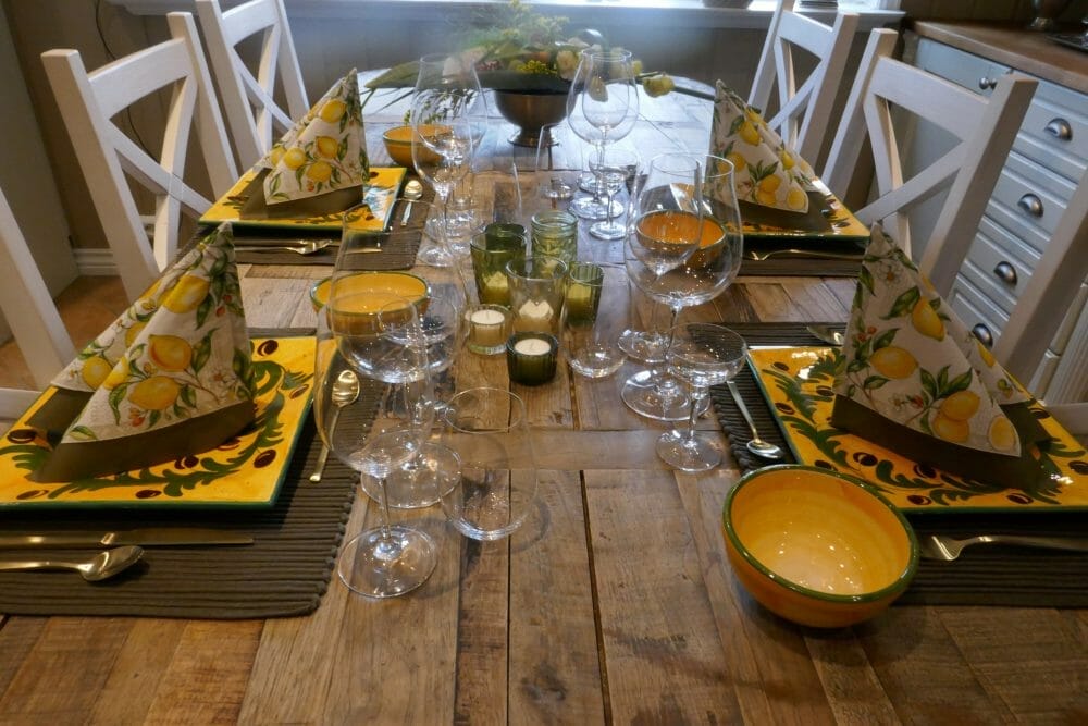 Spansk borddekking forbindes med glade farger og jeg er så heldig at jeg har et spansk service, som vi fant hos en keramiker på la Manga. I tillegg til spansk mat, passer det fint til de andre landene rundt Middelhavet også.