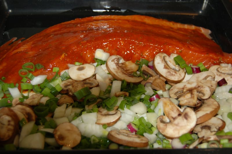 Smør en ildfast form med olje og legg i laksen med skinnsiden ned. Dekk den med blandingen. Legg løk, vårløk og sopp rundt. Dekk formen med folie og sett den i stekovn på 200 grader eller i middels varm grill i 30 – 35 minutter.