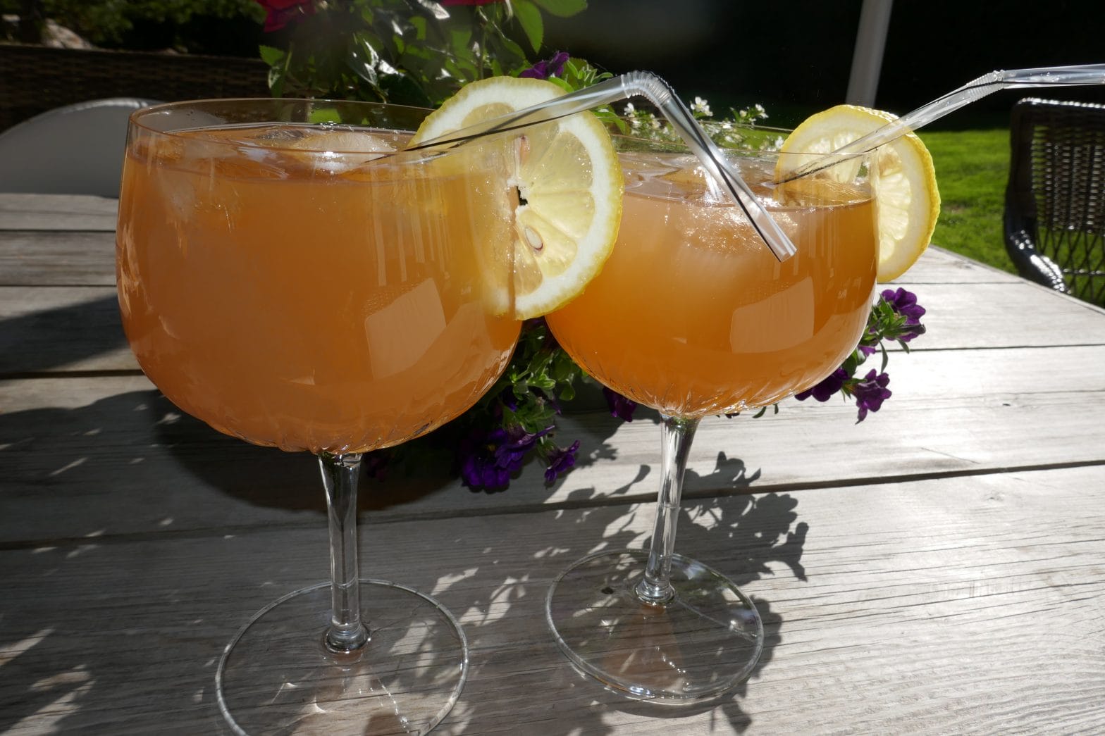 Fyll 4 glass med isbiter. Bland sammen alle ingrediensene til drinken og fordel den i glassene. Pynt med en sitron- eller appelsinskive.