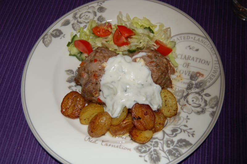 Bløt loffen i vann. Tilsett kjøttdeig, egg, rødløk, tsazikikrydder, pepper, rød paprika, finhakket persille og fetaost. Form deigen til biffer og stek dem i smør i stekepanne til de får fin farge på begge sider, før de legges over i ildfast form og etterstekes ved 225° i ca. 10 minutter.