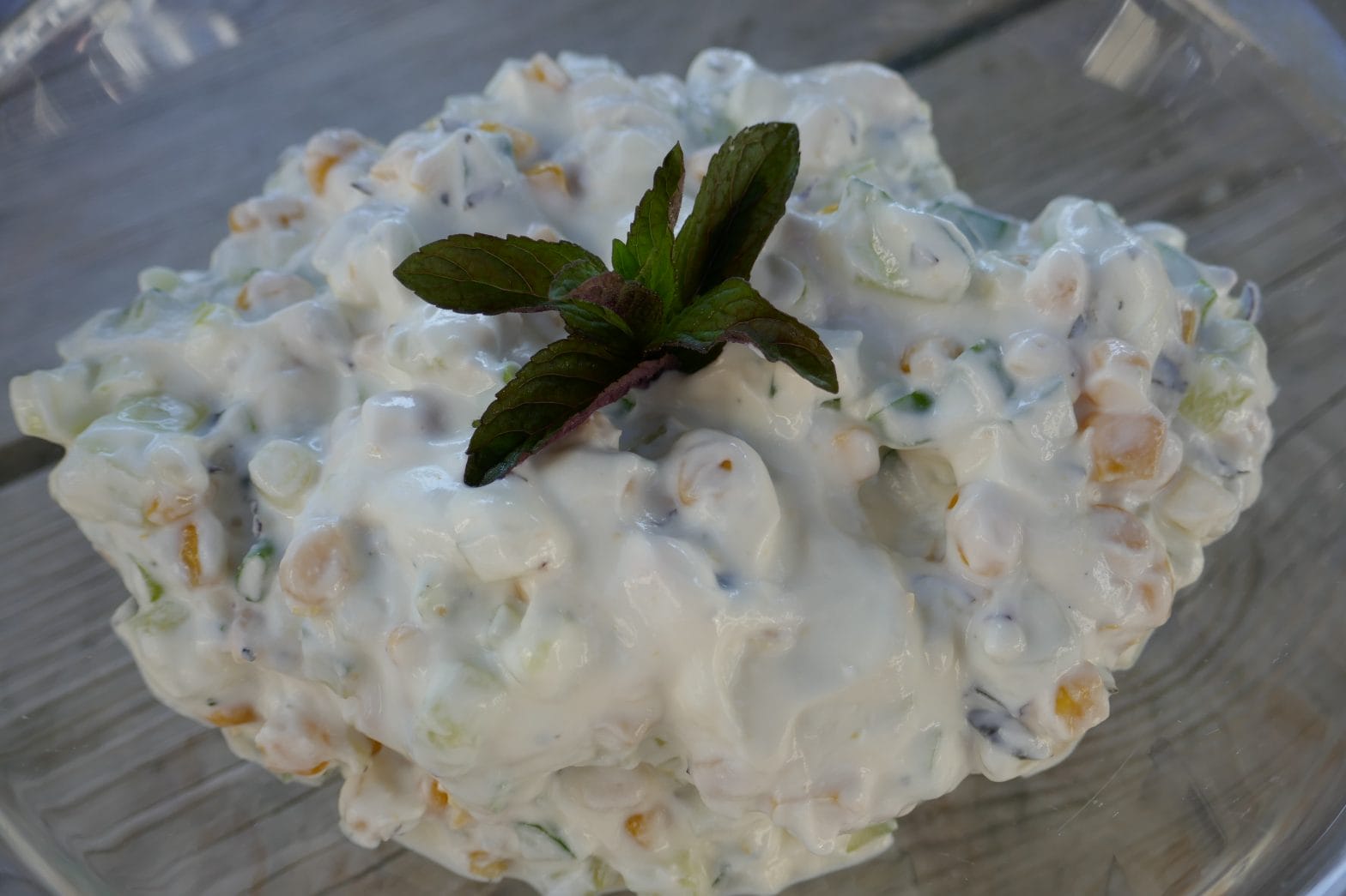 Yoghurtsalat med mais passer til det meste av grillmat. Jeg liker den ekstra godt til sterk mat og du trenger ikke saus i tillegg.