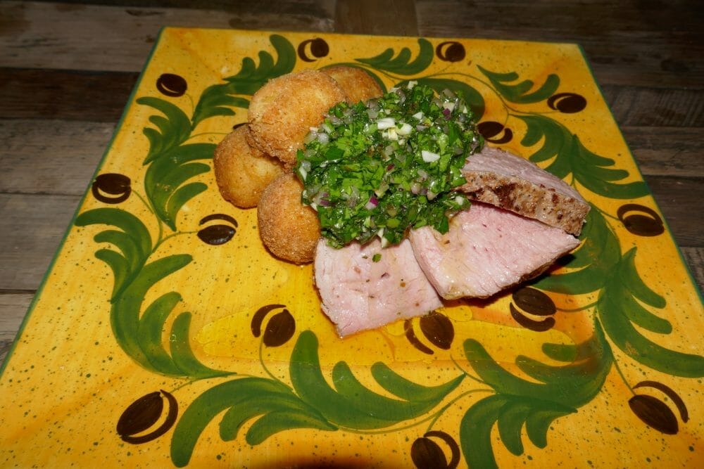 Svinefilet med pommes noisettes og chimichurri er nydelig selskapsmat. Chimichurri kan lages klart noen timer i forveien og settes i romtemperatur 1 time før den skal spises. Pommes noisettes kan kjøpes i frysedisken, men hjemmelaget smaker selvfølgelig bedre.