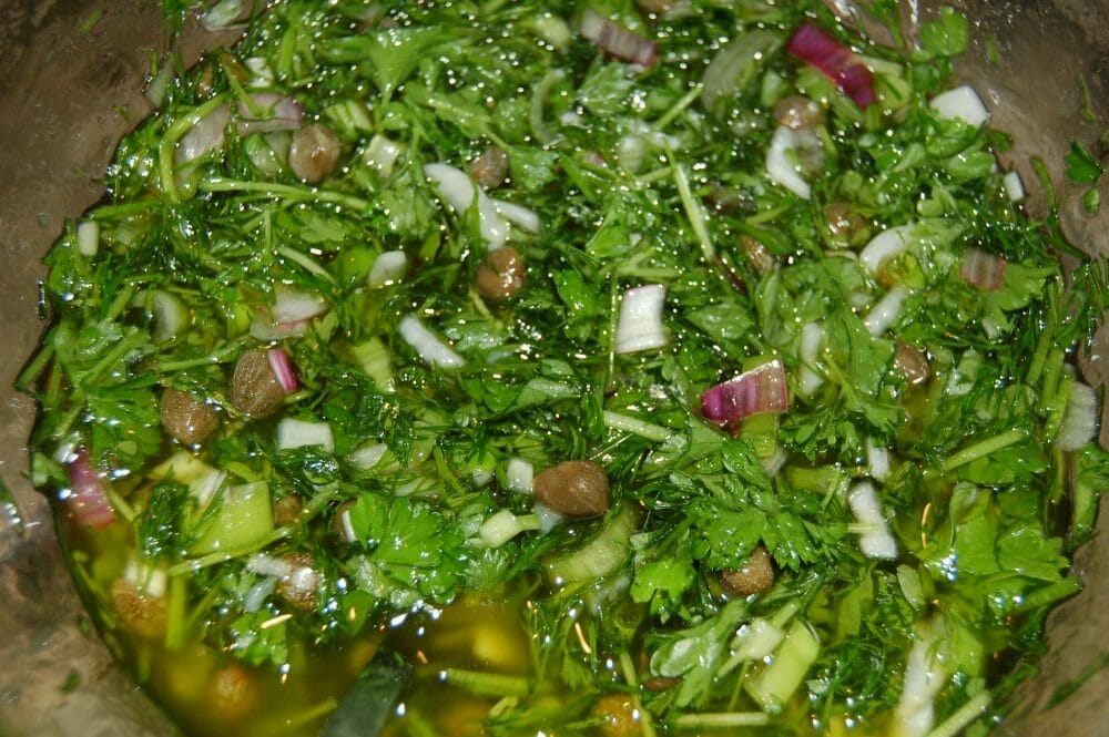 Jeg legger linsene på tallerkenen, så tunfisken og til slutt legger jeg på godt med «gremolata».