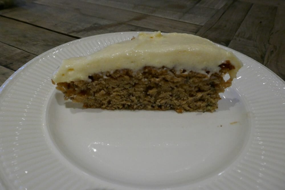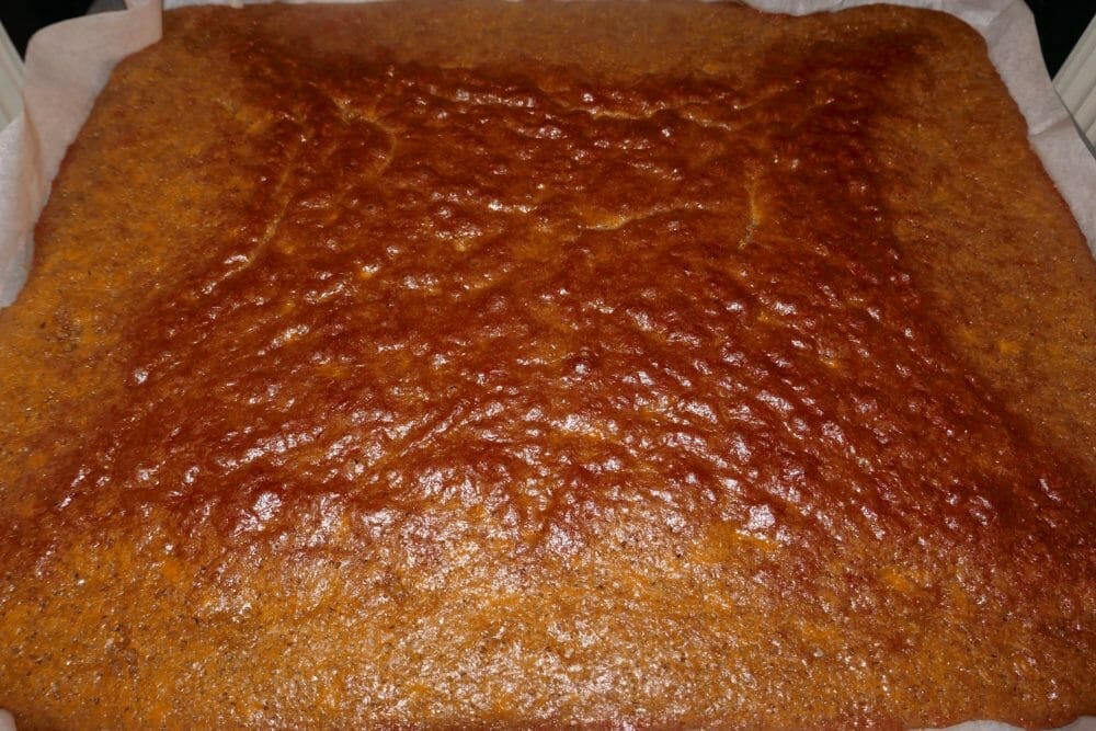 Kle en langpanne med bakepapir, fordel røren utover og stek i 45-50 minutter på 175 grader. Bruk en pinne for å sjekke om den er ferdig. Kaken er klar, når pinnen kommer ren ut igjen.