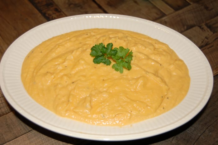 Alt kjøres til en jevn masse med stavmikser. Smak til med salt og pepper. Settes kaldt, mens du tilbreder kalven.