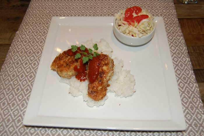 Servering av kokostonkatsu: Anrett med ris i bunnen av tallerkenen, deretter svinefiletene, hell saus over og server salaten ved siden av.