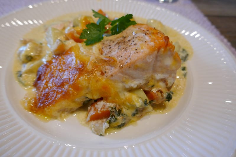 Bakepoteter skjæres i tynne skiver og legges i stabler i en smurt ildfast form, sammen med skivet rødløk, salt og pepper. Strø parmesan på toppen og legg på en klatt smør. Jeg bruker en metallring under stablingen, slik at alt holder seg på plass. Om du ikke har metallring, kan du fylle potet- og løkstablene i små, ildfaste former. Bak potet- og løkstabler i stekeovnen på 175 grader i 60 minutter.