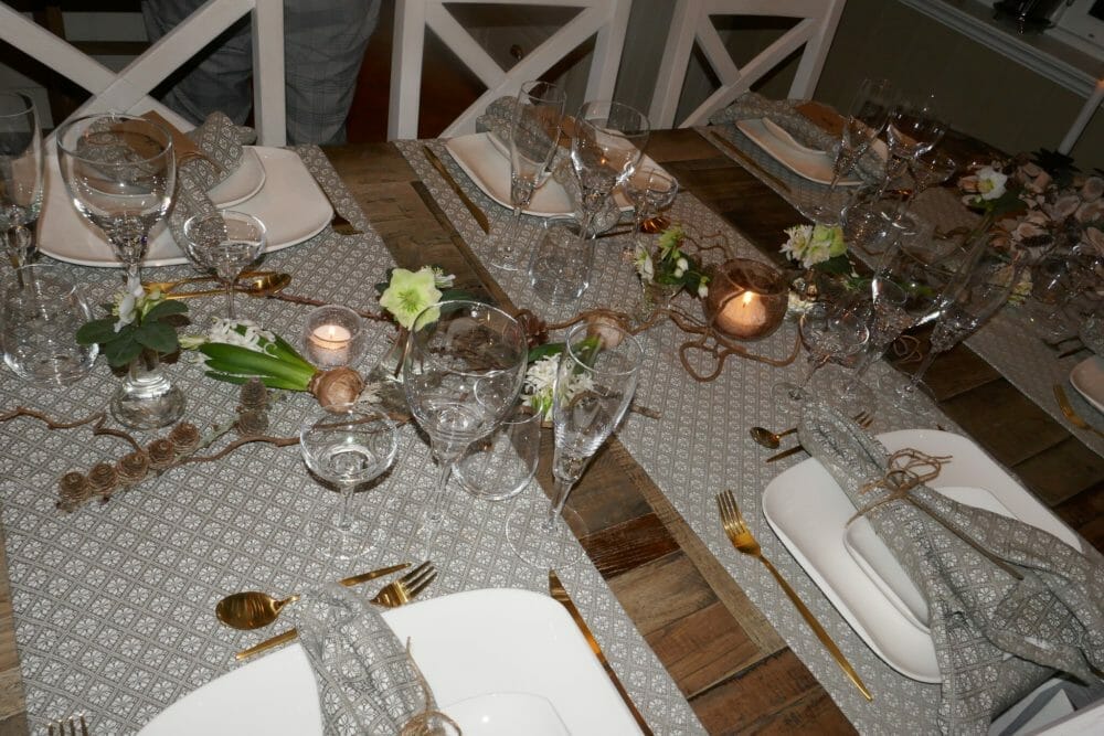 Jeg sparer på fine kvister fra hagen og naturen rundt meg, så de har jeg tatt frem og fordelt utover midten av bordet. Jeg har også vært i blomsterbutikken og kjøpt en julerose, som jeg har klippet blomster og blader av. De har jeg satt i små vaser rundt på bordet. Jeg fikk også noen svibler billig, fordi de nærmest seg slutten av blomstringen. De har jeg vasket rene for jord og lagt på med løken og alt. Til slutt har jeg satt inn små telysholdere her og der.