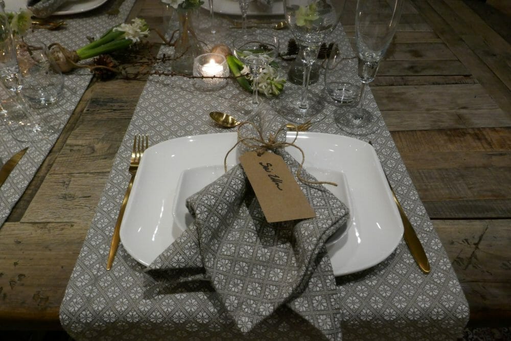 Jeg har valgt vakre, dusgrønne løpere og servietter, som heter Trine, fra BGA fotobutikk. De passer perfekt til denne stilen og de finnes i naturfarget også, om du foretrekker det. Serviettene har jeg lagt litt “tilfeldig” og bundet på gammeldagse pakkelapper med hyssing av hamp, som bordkort.