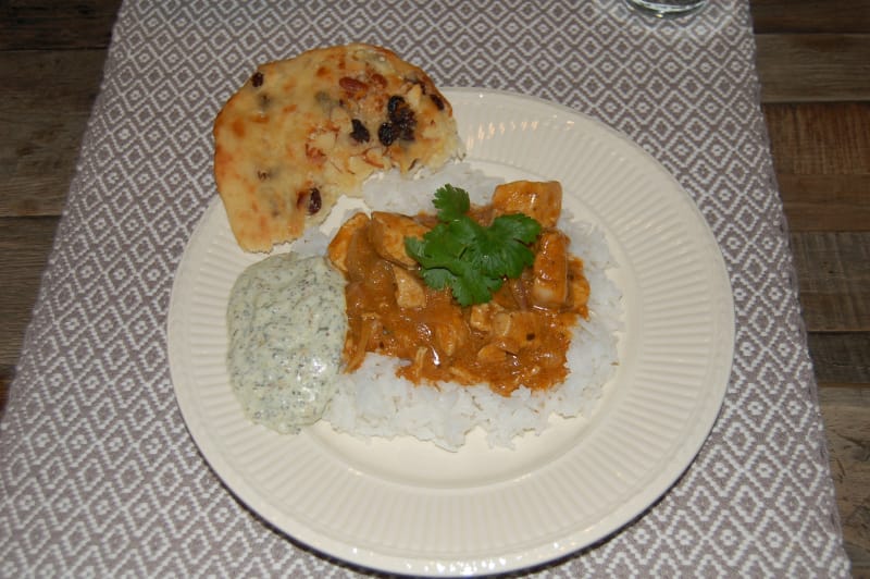 Butter chicken, også kalt Murgh Makhani, er en nydelig rett, som serveres i India og Pakistan. Den er ikke vanskelig å lage heller. Opprinnelig brukes ghee, som er klarnet smør, men det går helt fint å bruke vanlig smør også. 700 g kyllingfilet 2 ss tandoori masala 2 ss nøytral olje (f.eks raps) 1 finhakket løk Ghee eller smør til steking 2 dl ghee i en kjele 1 boks hakkede tomater (helst Mutti) 2 fedd finhakket hvitløk 7 dl kremfløte 2 ts salt 1 ts kajennepepper 1 ss garam masala Del kyllingfileten i terninger og legg den i en marinade av tandoori masala og olje. La det marinere i minimum 2 timer, men gjerne over natten. Stek løken i ghee eller smør på middels varme til den er karamellisert. Samtidig smeltes 2 dl ghee i en kjele, sammen med hakkede tomater, hvitløk, kremfløte, salt, kajennepepper, og garam masala. La det koke på lav varme i 30 minutter under lokk. Rør av og til, så det ikke legger seg ved. Tilsett den karamelliserte løken. Mens sausen koker, legges kyllingbrystterningene ut over en bakeplate og stekes på 200 grader, midt i ovnen, i ca. 15 minutter. Legg kyllingen i sausen og la det småkoke i 5 minutter før servering. Jeg serverer butter chicken med ris, nanbrød og raita. Du kan selvfølgelig kjøpe halvstekte nanbrød i butikken, men hjemmelaget smaker bedre og du finner flere spennende oppskrifter på nanbrød her. Om du vil abonnere på nyheter fra bloggen, kan du melde deg på ved å sende oss e-postadressen din her. Nyhetsbrevet er helt gratis. Du kan også følge bloggen på Facebook.