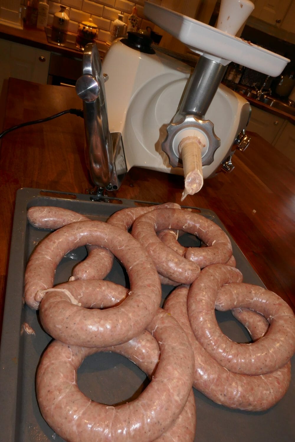 Skyll tarmen godt i rennende vann og tre den på pølsehornet, stapp pølser og bind opp med hyssing.