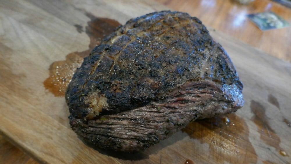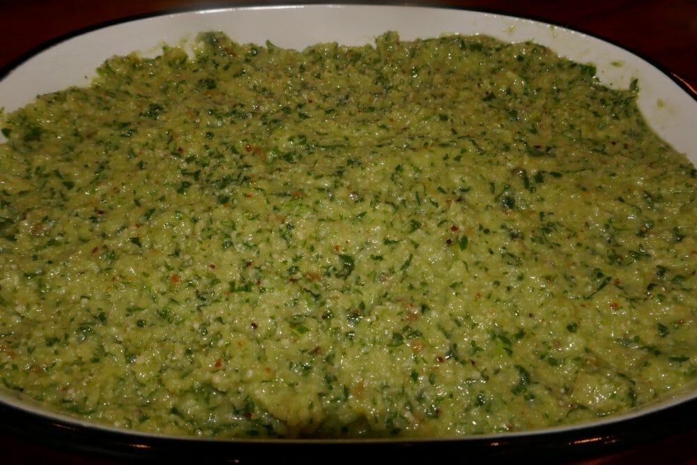 Kjør innmaten av loffen, bladpersille, hvitløk, parmesan og olivenolje til en jevn masse med stavmikseren. Konsistensen skal være som tykk grøt.