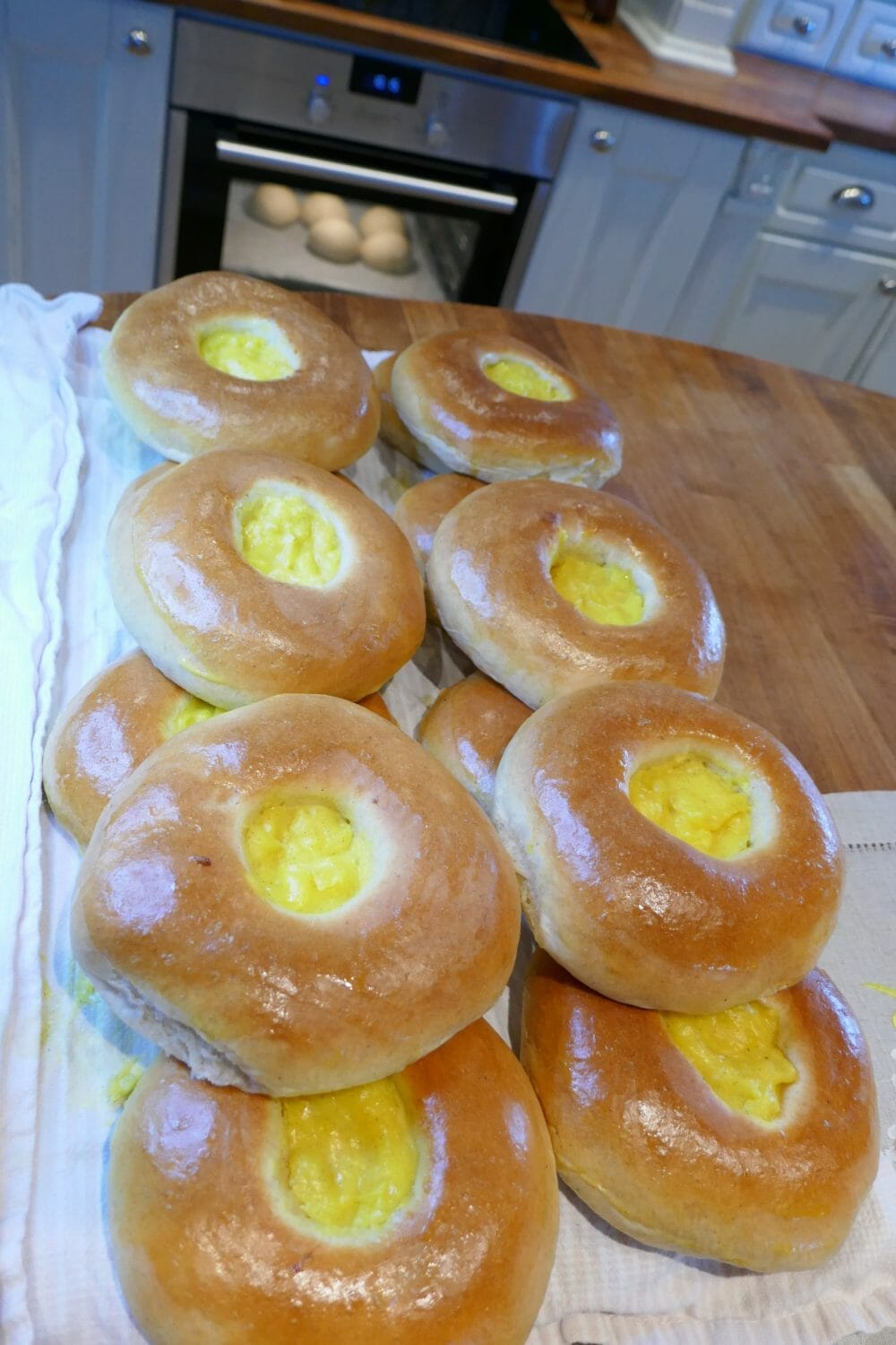 Alt eltes godt sammen og heves lenge, gjerne et par timer. Del deigen i emner på ca 140 g og form dem boller, som kjevles ut til flate, runde brød. Trykk dem flate på midten, der kremen skal ligge. Legg 1 ss vaniljekrem i gropen og la dem heve lenge igjen, gjerne en time eller to til.