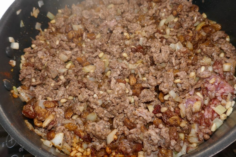 Brun pinjekjernene lett i tørr stekepanne, hell dem over i en liten bolle og sett til side. Varm olje i en gryte eller sautépanne og stek løk og hvitløk i 2 til 3 minutter, mens du rører. Tilsett kjøttdeig og brun den, mens du smuldrer det opp, så det blir ganske finkornet. Deretter tilsetter du alt krydderet og brun videre i 1 minutt, under omrøring. Tilsett passata, sultanas, pinjekjerner og vann og bland godt sammen. La det småkoke uten lokk, til væsken reduseres slik at fyllet er fuktig, men ikke vannaktig. Fjern fra komfyren og la den avkjøles litt før neste prosess.
