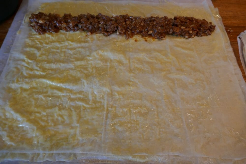 Legg 1/3 av lammefyllet langs den ene langsiden og rull sammen til en pølse. Det skal ikke være stramt, for da kan filodeigen revne, den er ganske skjør. Lag 3 like pølser.