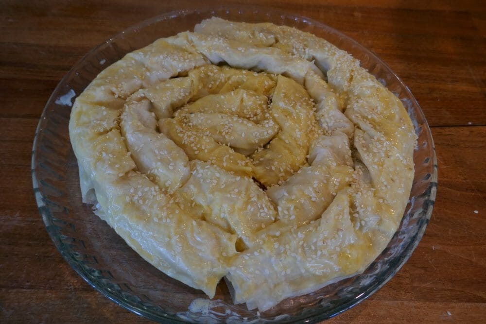 Pensle toppen med smør, dryss over sesamfrø og stek i ovnen på 200 grader i ca. 40 min. til böreken er gyllen.