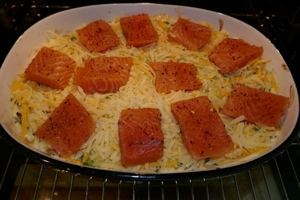 Ta formen ut av ovnen, dryss over ost og legg fiskestykkene på toppen.