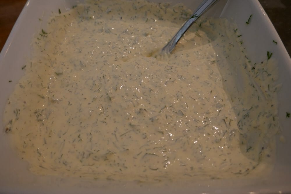 Bland creme fraiche, rømme, hvitløk og og urter og smak til med salt og pepper, før du rører inn grønnsakene.