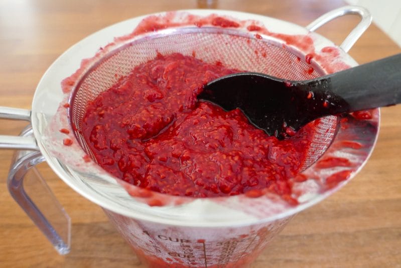 Kok opp vann og sukker og rør til sukkeret er oppløst. Kjør bringebærene i noen sekunder med stavmikseren og bland inn sukkerlaken. Hell blandingen gjennom en sil og smak til med limesaft.